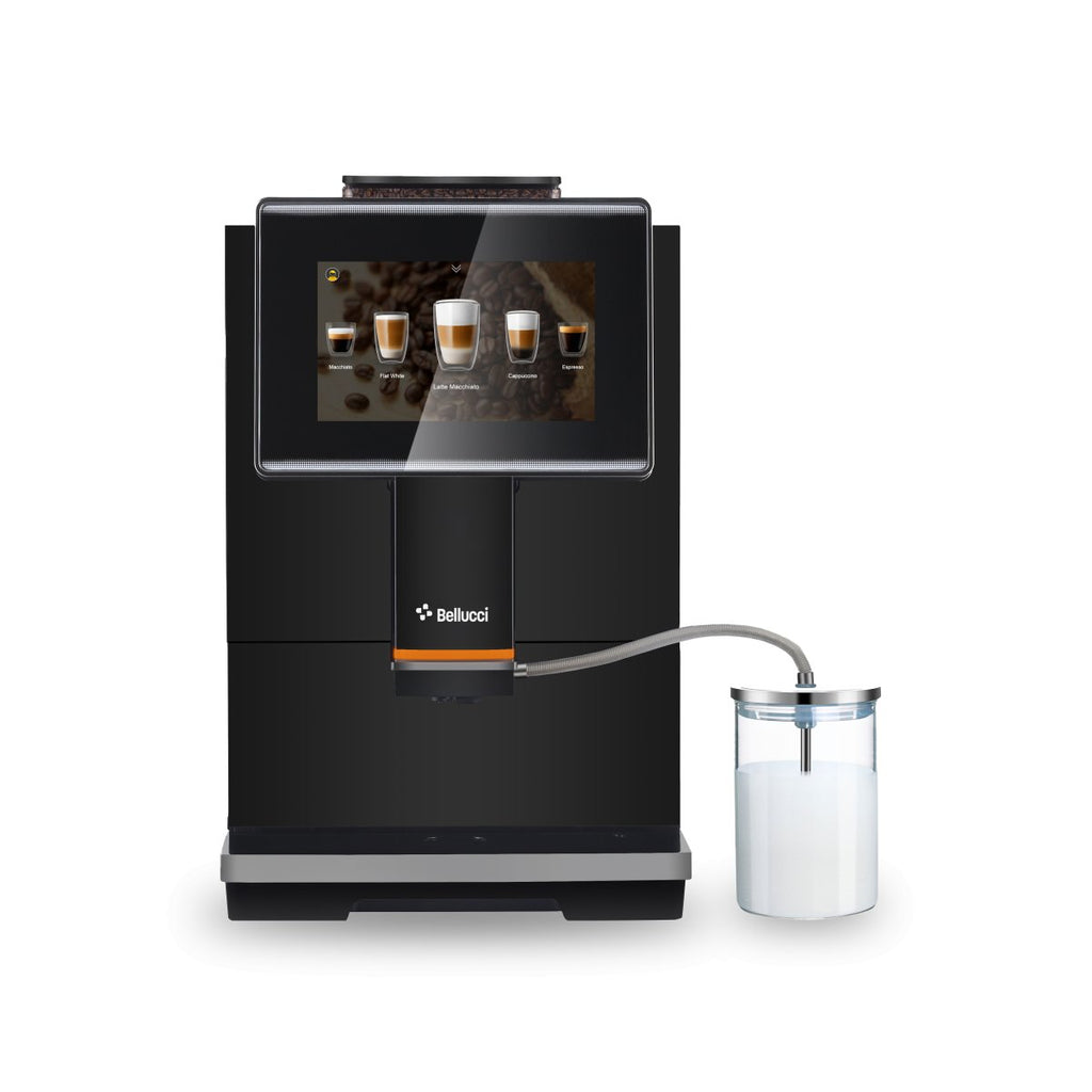 The Bellucci Bistro is designed for passionate coffee lovers who demand both professional features and simplicity in their home brewing experience. With a stunning 7-inch touchscreen interface, this high-end coffee machine offers access to 15 customizable beverages, ranging from classic espresso to creamy cappuccinos. It includes professional-grade elements such as ceramic burrs and advanced milk frothing systems, making every cup a remarkable experience. The Bellucci Bistro is not only powerful but also visually appealing, featuring a sleek glass front and included milk container.