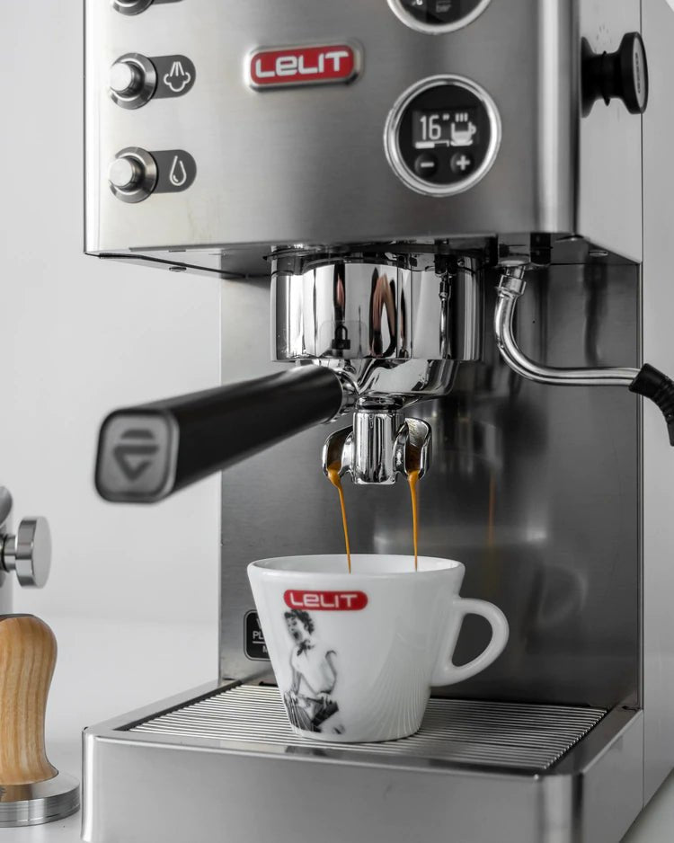 - 58 mm commercial portafilter with new Lelit ergonomic handle and Coffee Slide spout